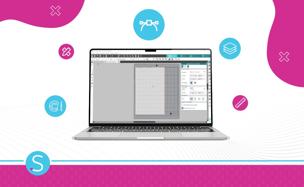 O Silhouette Studio é o software oficial de design e controle para todas as máquinas de corte Silhouette. É nele que você cria projetos do zero, importa designs externos, configura parâmetros de corte (velocidade, força, profundidade) e envia os comandos para sua máquina executar.