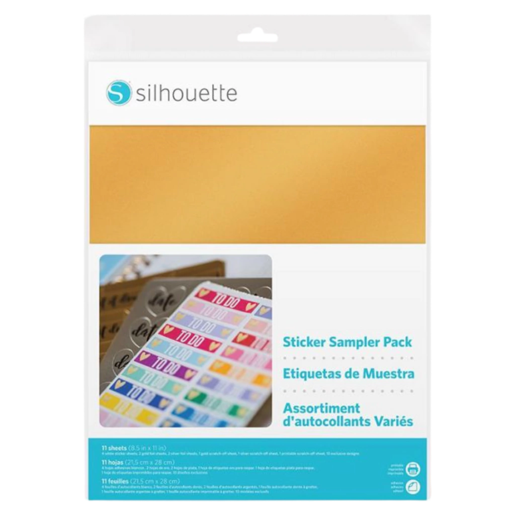 O Conjunto de Amostra de Adesivos é uma ótima maneira de começar a criar seus próprios adesivos personalizados. O kit inclui alguns designs de planejadores pré-criados para ajudá-lo a iniciar a criação de adesivos incríveis para suas necessidades de calendário e planejamento. Com as folhas de adesivo branco, folha de prata e folha de ouro incluídas, você pode simplesmente imprimir uma imagem e, em seguida, recortar ao redor do contorno usando o recurso Imprimir e Cortar da máquina de corte Silhouette. Além disso, as folhas de adesivo raspadinha permitem que você cubra informações ou citações inspiradoras que deseja manter ocultas até que esteja pronto para revelá-las.