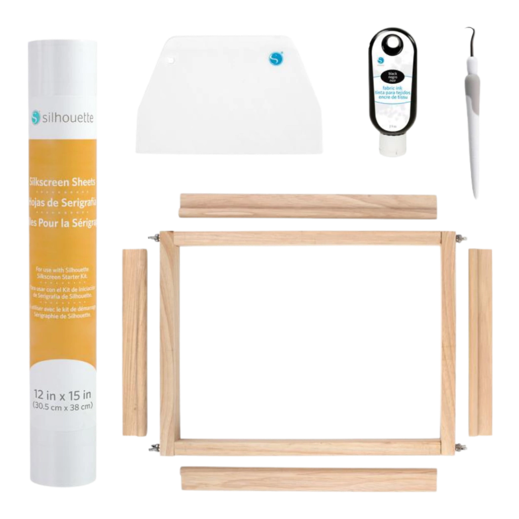 O Kit Inicial de Serigrafia contém todos os materiais necessários para começar a criar projetos personalizados em superfícies de tecido, incluindo uma moldura especial para segurar seu modelo, folhas de vinil termocolante para cortar seus modelos e folhas de serigrafia para aderir ao seu modelo recortado.