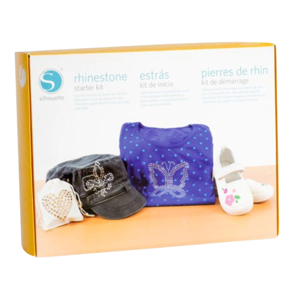 Este kit inicial inclui todos os produtos necessários para começar a criar projetos com strass, incluindo materiais para fazer moldes personalizados, strass e uma escova para posicionamento de strass.